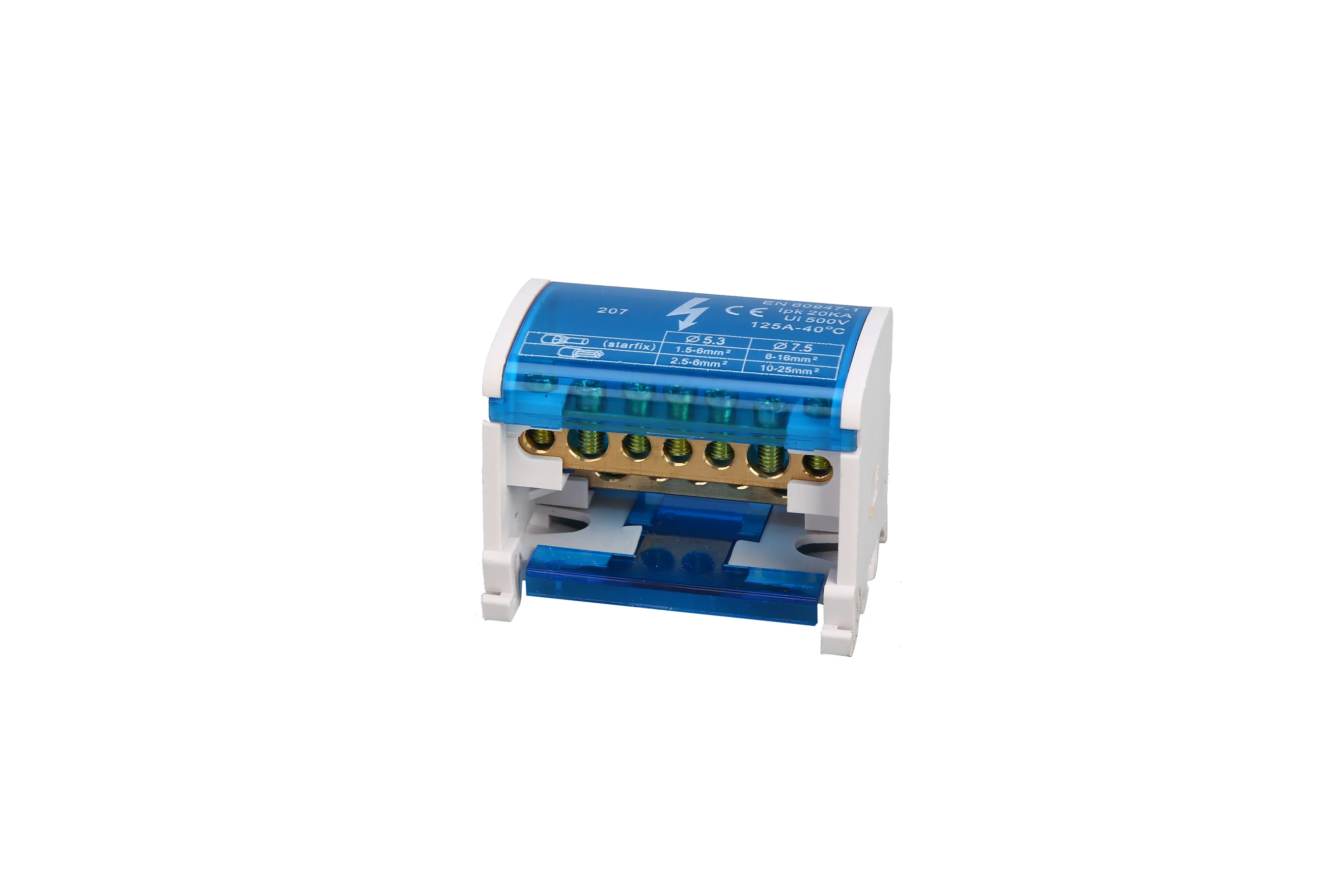 C01-207 two phase distribution block with brass conductors, PA66 UL94V-2 housing, 500V 125A rating, CE/RoHS certified, supports secure 35mm DIN rail or screw mounting.