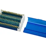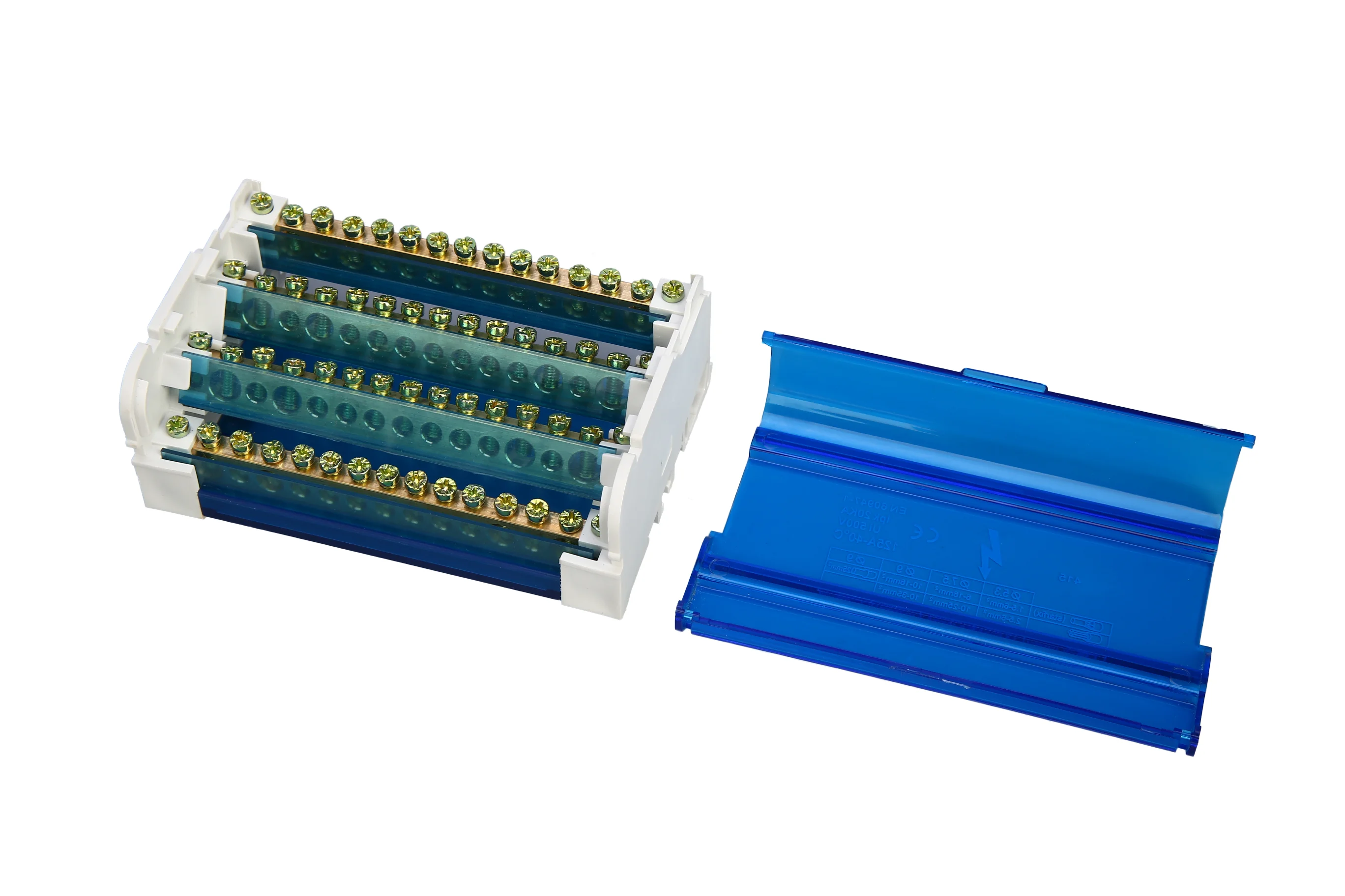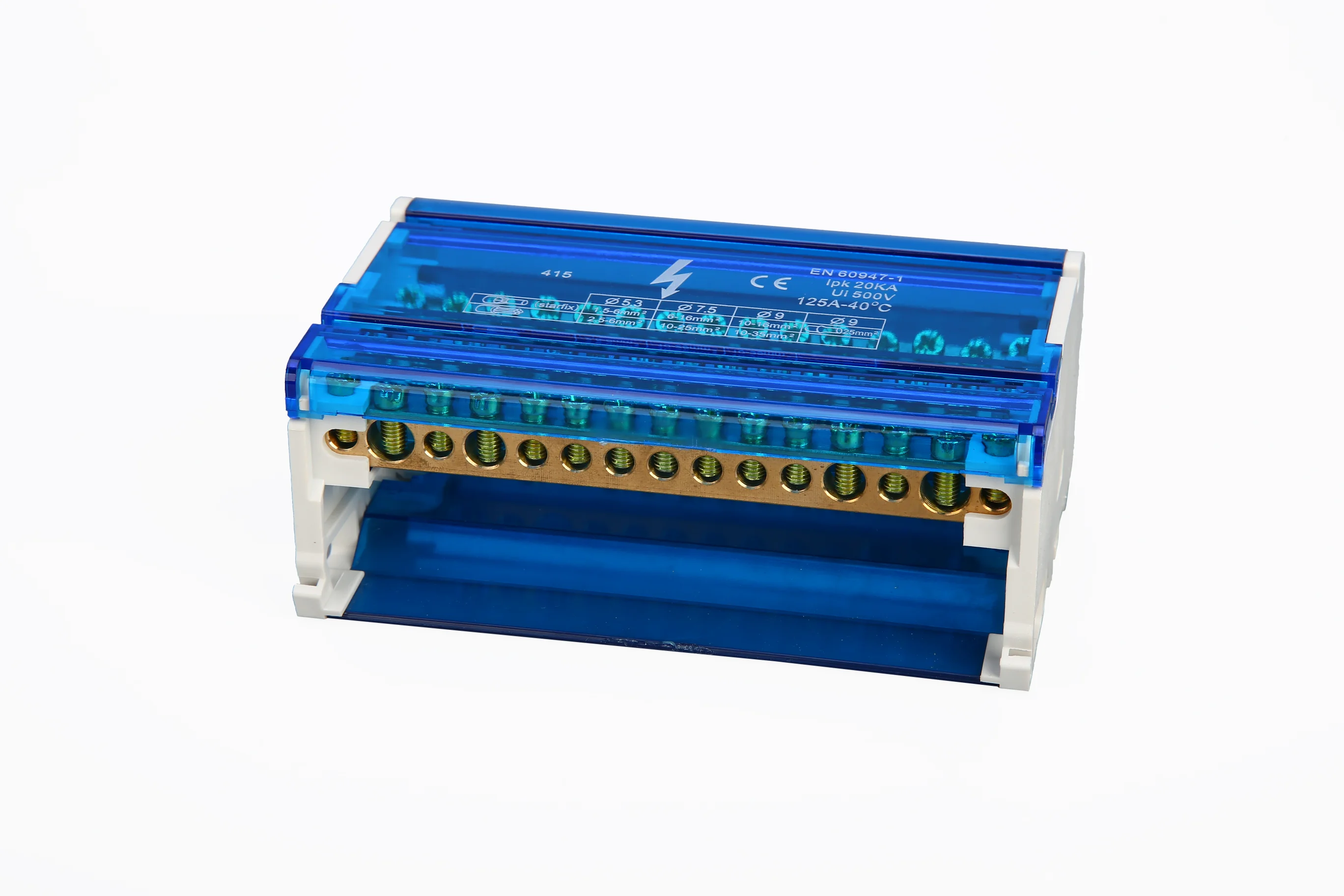 C01-415 125A four-phase connection box with copper conductors, PA66 V-2 housing, CE RoHS certified, 500V, standard blue or custom colors, rail/screw installation.
