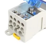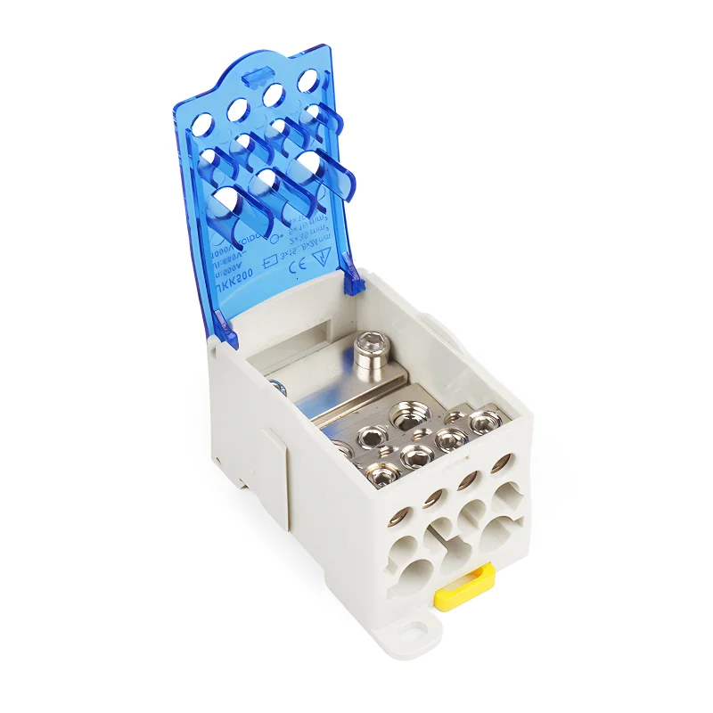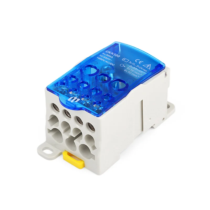 UKK 500A single phase electrical block with nickel-plated brass conductors, PA66 UL94V-2 housing, 690V rating, 51kA IPk, CE/RoHS certified, suitable for DIN rail or screw mounting.